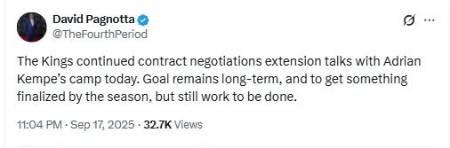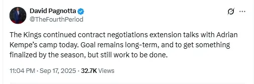 “The Kings continued contract negotiations extension talks with Adrian Kempe’s camp today. Goal remains long-term, and to get something finalized by the season, but still work to be done,” reported NHL insider David Pagnotta on X.