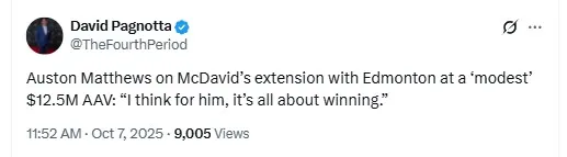 Matthews shared his thoughts on the extension via David Pagnotta on “X,” noting the focus McDavid places on winning: “I think for him, it’s all about winning,” Matthews said, describing the deal as “modest” in the context of McDavid’s immense talent and impact.