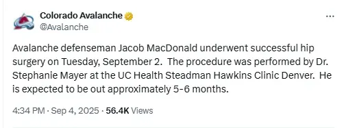 The Colorado Avalanche, led by Nathan MacKinnon, faced a major setback this week as veteran defenseman Jacob MacDonald underwent successful hip surgery and is expected to be sidelined for 5–6 months. The procedure, performed at the UC Health Steadman Hawkins Clinic in Denver by Dr. Stephanie Mayer, marks a significant loss for the team as they enter a crucial stretch of the NHL season.