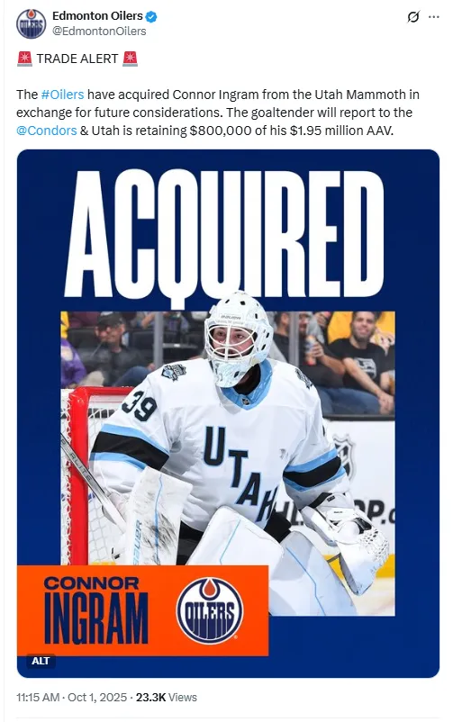 Ingram, who carries a $1.95 million average annual value, will report to the Bakersfield Condors, the Oilers’ AHL affiliate. Utah is retaining $800,000 of Ingram’s salary, allowing Edmonton to manage cap space efficiently.