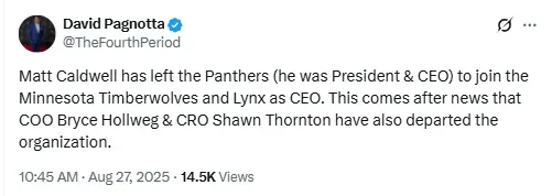 NHL insider David Pagnotta reported, “Matt Caldwell has left the Panthers (he was President & CEO) to join the Minnesota Timberwolves and Lynx as CEO. This comes after news that COO Bryce Hollweg & CRO Shawn Thornton have also departed the organization.” The collective exits raise questions about how the Panthers will maintain business and hockey operations moving forward.
