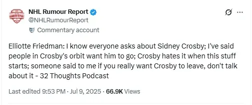But now, as trade rumors swirl, frustration is bubbling to the surface. During the latest episode of the 32 Thoughts Podcast, NHL insider Elliotte Friedman shared what he heard from someone close to Crosbyâs inner circle: