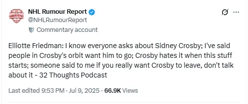 “I know everyone asks about Sidney Crosby; I’ve said people in Crosby’s orbit want him to go; Crosby hates it when this stuff starts; someone said to me if you really want Crosby to leave, don’t talk about it.”