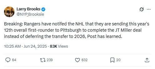 According to Larry Brooks of the New York Post, Rangers have notified the NHL that they are sending this year’s 12th overall first-rounder to Pittsburgh to complete the JT Miller deal instead of deferring the transfer to 2026, Post has learned.” With this announcement, the Penguins now hold a second first-round selection, positioning themselves strongly heading into the draft.