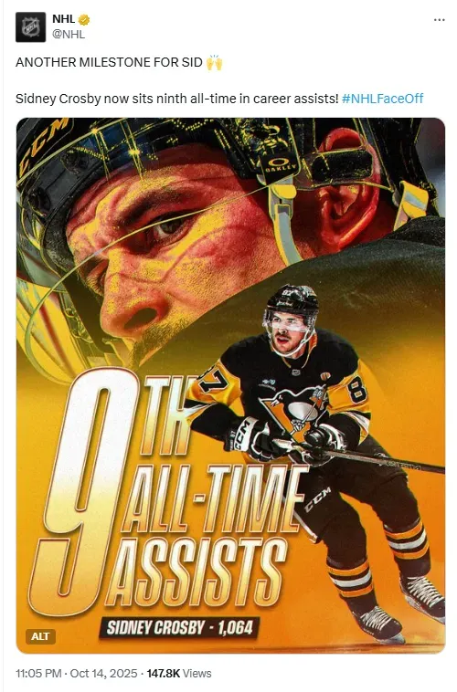 The next opportunity for Crosby to extend his numbers comes Thursday, when the Penguins face the Los Angeles Kings on the road. Every game adds to the potential for more milestones, keeping fans and analysts alike riveted to his historic career.