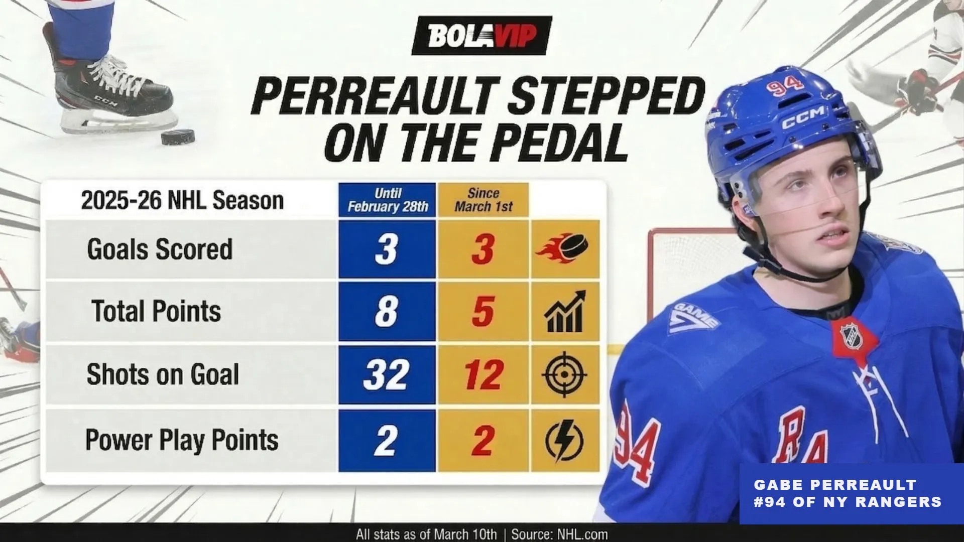Moreover, since the start of March, Perreault has been on a heater. The rookie had put up three goals and five assists so far in the 2025-26 NHL season. Since the third month of the year started, Perreault has scored as many goals, while assisting in two tallies.
