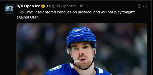 According to Bleacher Report Open Ice, Chytil has been placed in concussion protocol by the Canucks, ruling him out for the game. So far this season, he has recorded six points with his new team.