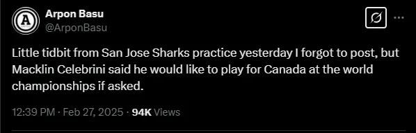 According to information revealed by Arpon Basu, Macklin Celebrini has stated that he would be willing to play for Canada at the upcoming World Championships if called. The young star has made it clear that he is ready to take on the challenge and contribute to the national team.