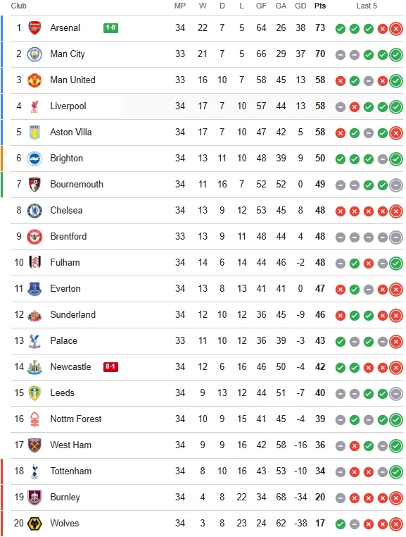 With this result, Arsenal move to 73 points, establishing a three-point cushion over Manchester City (70 points). However, the title race remains extremely tight: Pep Guardiola’s men have a game in hand, as they were absent from league play this weekend to defeat Southampton in the FA Cup semifinals.