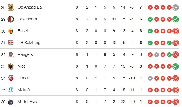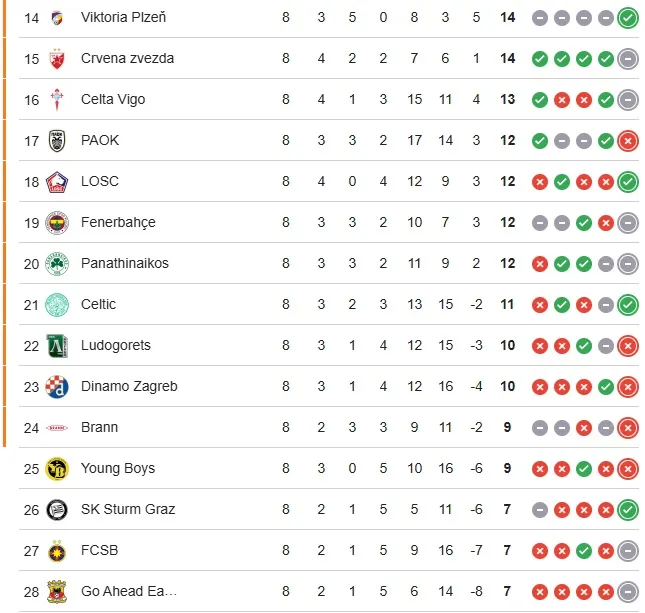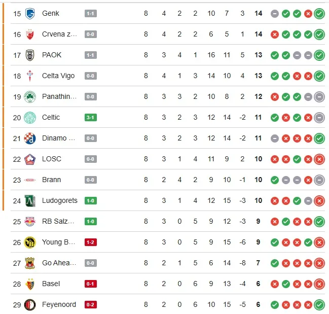 While the standings remained relatively stable for most of the evening, Ludogorets provided the night’s biggest surge. Starting the day on the outside looking in, the Bulgarian side fought their way into the knockout playoff zone with a crucial 1-0 home victory, keeping their European dreams alive.