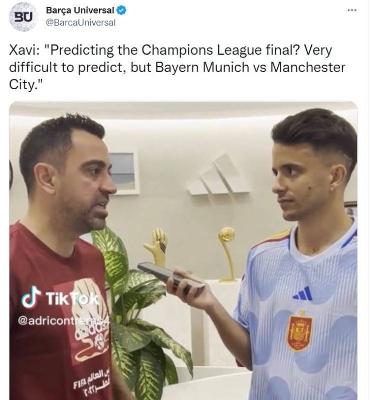 Talking to TikTok user @adricontreras4, Xavi predicted Manchester City and Bayern Munich to reach the 2022-23 UEFA Champions League final. That means that he imagines the German side eliminating Lionel Messi’s PSG in the Round of 16.