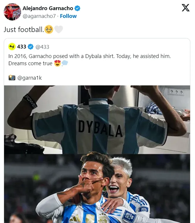 Shortly after the 20-year-old provided an assist for Dybala’s goal in Buenos Aires, a picture of a young Garnacho with a Dybala shirt went viral on social media. And the winger even reacted to the picture with an emotional message: “Just football.”