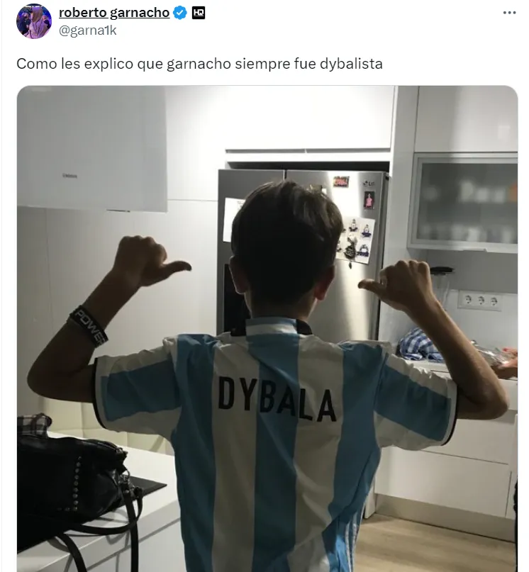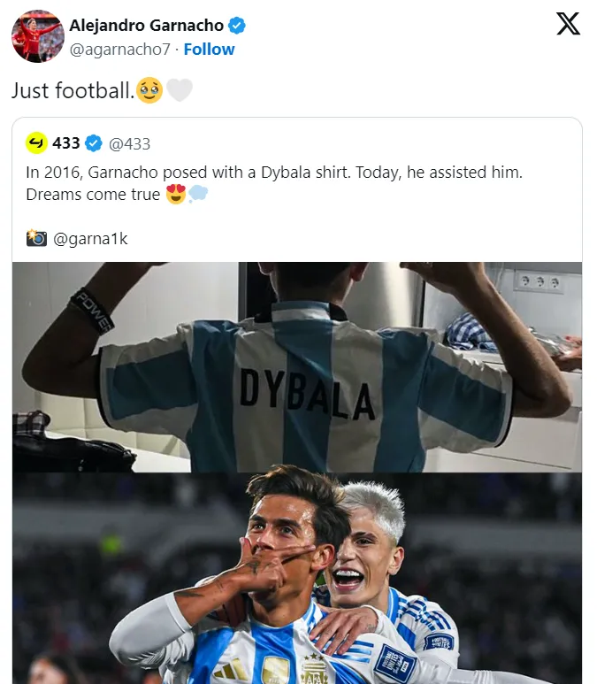 Shortly after the 20-year-old provided an assist for Dybalaâs goal in Buenos Aires, a picture of a young Garnacho with a Dybala shirt went viral on social media. And the winger even reacted to the picture with an emotional message: âJust football.â