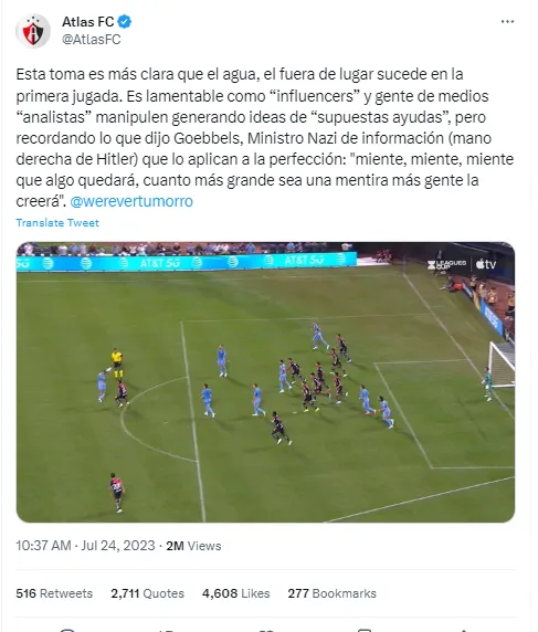 Atlas was able to win their game against the struggling New York side after scoring a goal and holding on to the lead while getting help from VAR as Justin Haak’s goal was called off for offsides at the 88th minute. Mexican sports influencer Gabo Montiel suggested that the goal was wrongfully called off and this in turn led to Atlas FC’s strange response quoting Nazi chief propagandist Joseph Goebbels.
