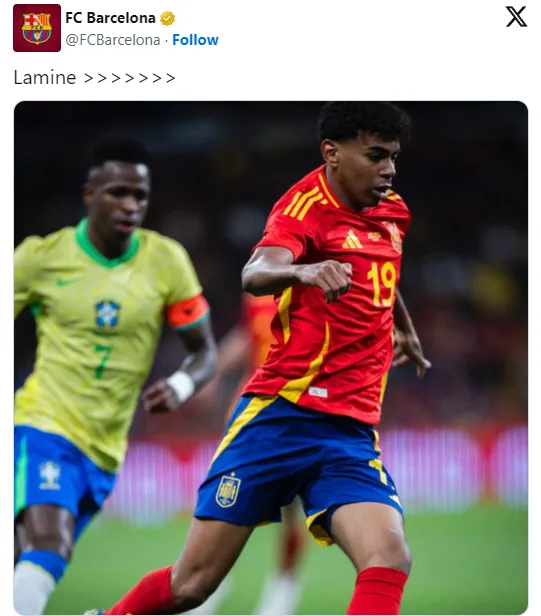 “Lamine >>>>>>>,” Barca’s post on X (formerly Twitter) read, along with a picture of Lamine Yamal with Vinicius chasing the Spanish youngster from behind. The subtle message from the club seemed to be that Yamal is better than the Real Madrid star.