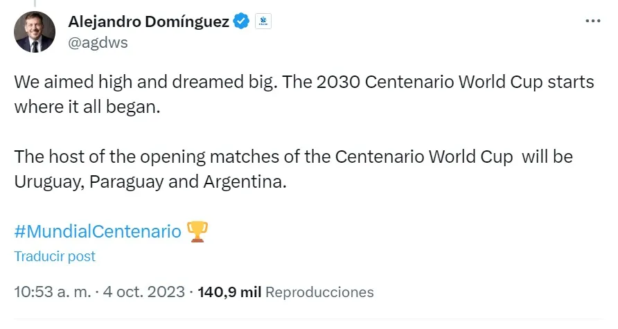 Alejandro Domínguez’s tweet indicates that the three host countries for the opening matches of the tournament will be Argentina, who hosted the World Cup in 1978, Paraguay, a first-time host and the country of Alejandro Domínguez’s birth and the official base of Conmebol. Finally, the World Cup returns to Uruguay, where La Celeste won their first FIFA World Cup, and third recognized world title in 1930.