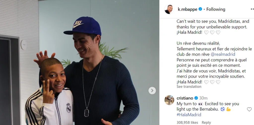 āMy turn to š Excited to see you light up the BernabĆ©u. Hala Madrid,ā wrote the Portuguese superstar, who appears on one of the pictures shared by Mbappe wearing Real Madrid clothing when he was a kid.