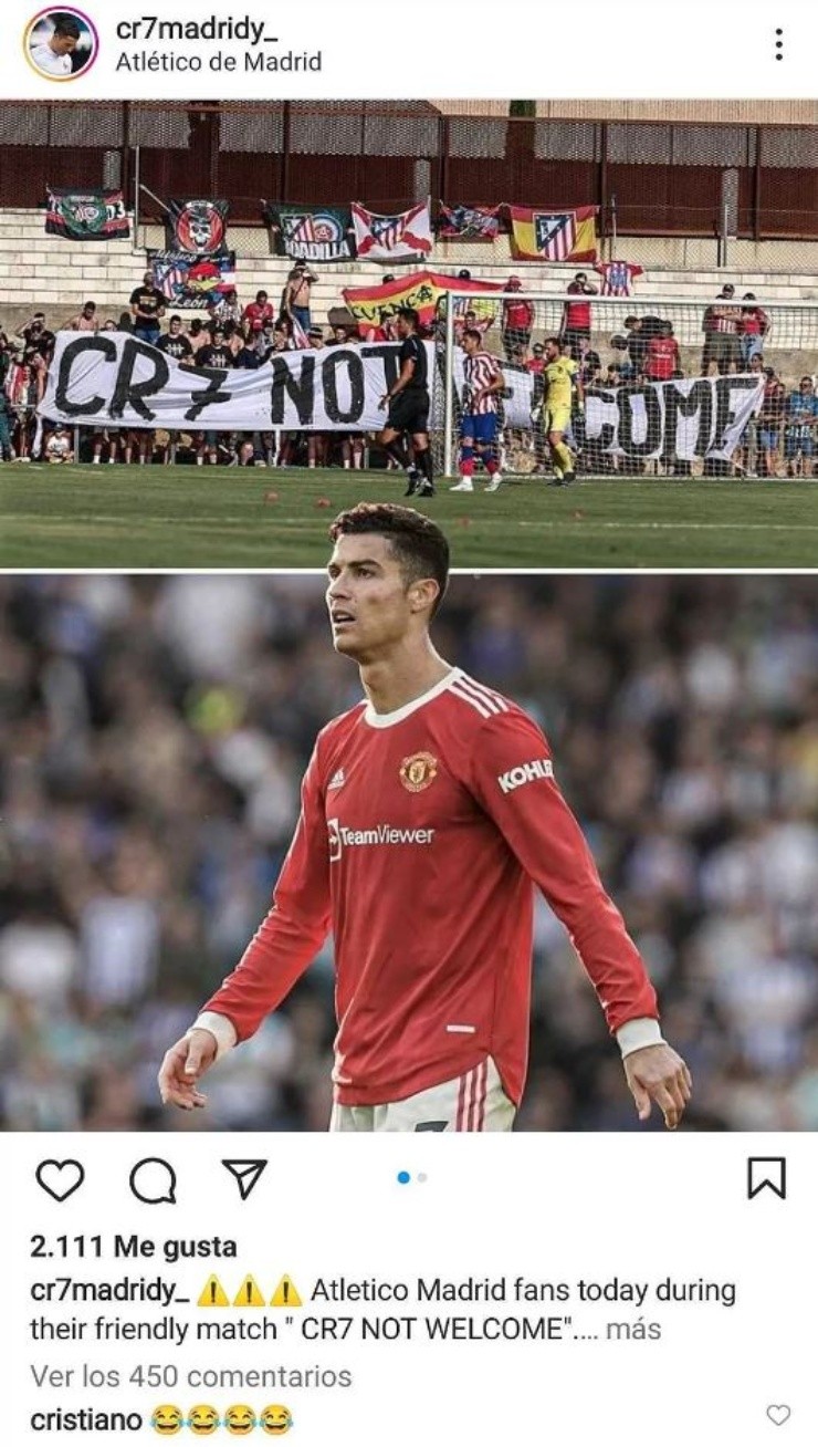 On top of that, a group of fans who attended the Colchoneros’ first preseason friendly against Numancia let the board know they do not want the Portuguese striker at the club, revealing a banner that read “CR7 not welcome,” and chanting against his possible arrival.It didn’t take long for Ronaldo to fire back.