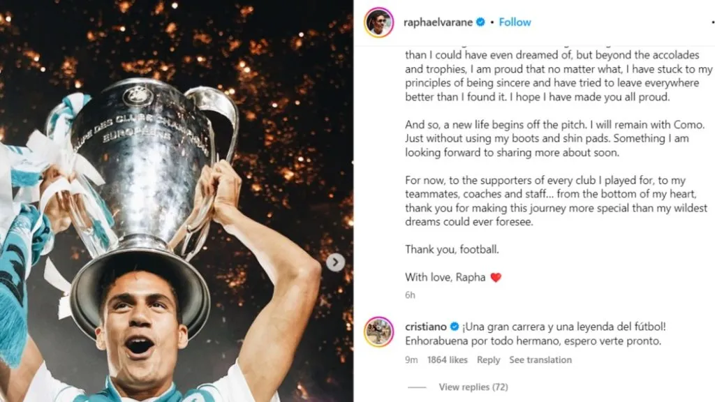 “A great career and a soccer legend. Congratulations for everything brother, hope to see you soon,” commented Ronaldo on Varane’s post confirming his retirement. Both players won fifteen titles with Real Madrid between 2011 and 2018.