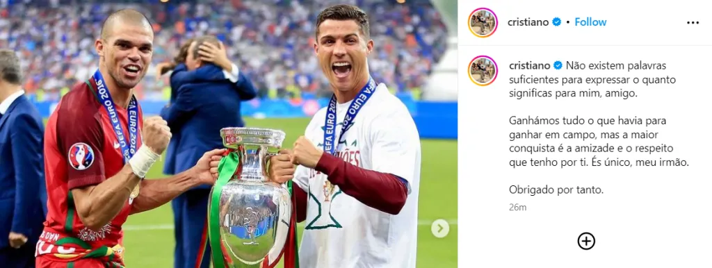 “There aren’t enough words to express how much you mean to me, my friend,” Cristiano wrote in Portuguese on Instagram along with many pictures of him and Pepe together. “We won everything there was to win on the field, but the greatest achievement is the friendship and respect I have for you. You are one of a kind, my brother. Thank you for so much.”