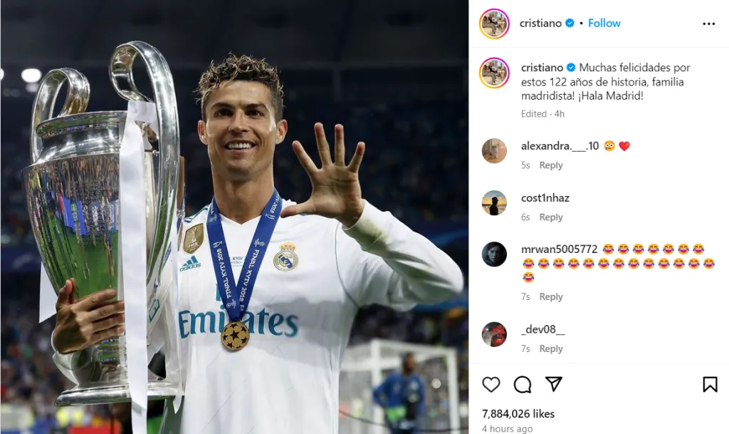 āCongratulations for these 122 years of history, Madridista family! Hala Madrid!,ā Ronaldo wrote on Instagram in honor of the Merenguesā 122nd anniversary along with a picture of himself after the 2018 UEFA Champions League final.