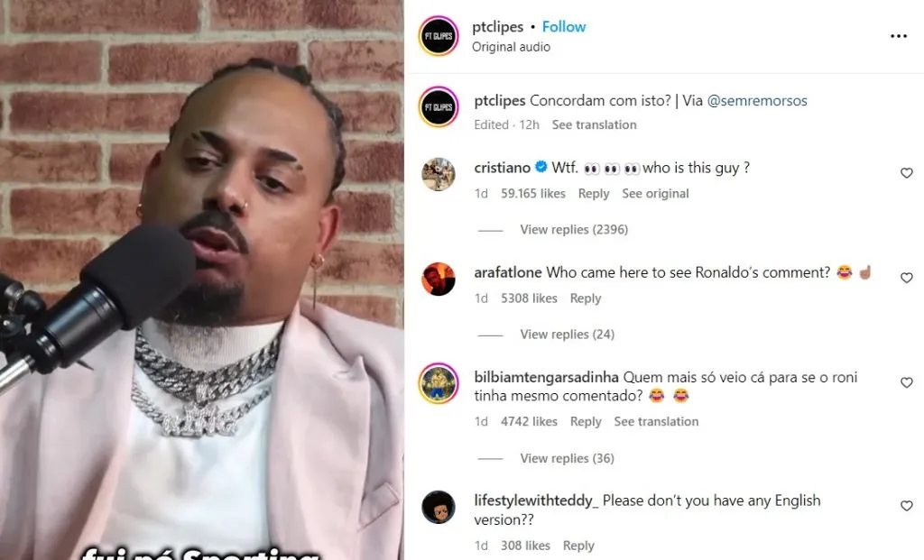 Paimās bold comments made so much noise that even Ronaldo heard them. In fact, the Portuguese superstar reacted to the video posted by PT Clipes on Instagram, throwing shade at Paim. āWtf. Who is this guy?,ā Ronaldo wrote.