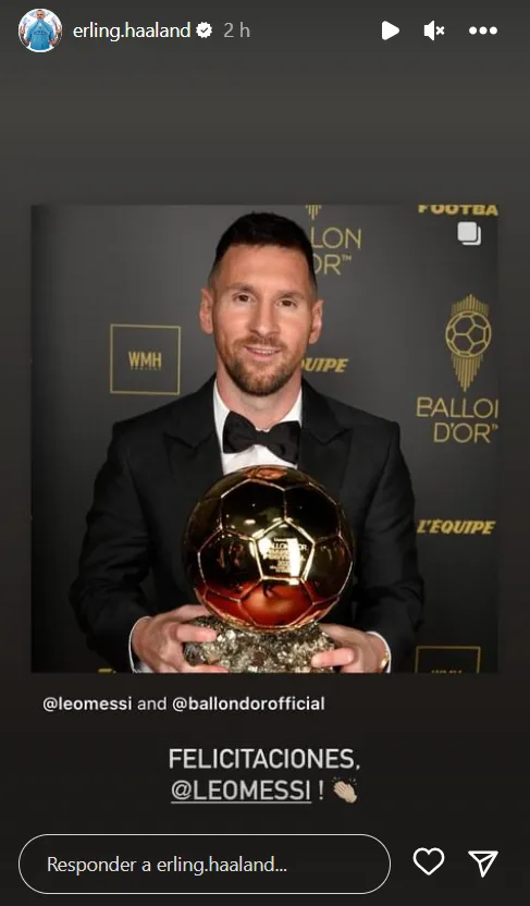 On Tuesday, Haaland took to social media to congratulate the 36-year-old on his eighth Ballon dâOr. âCongratulations, @leomessi!,â the Man City striker wrote in Spanish. The forward shared Messiâs post with the award on an Instagram story.