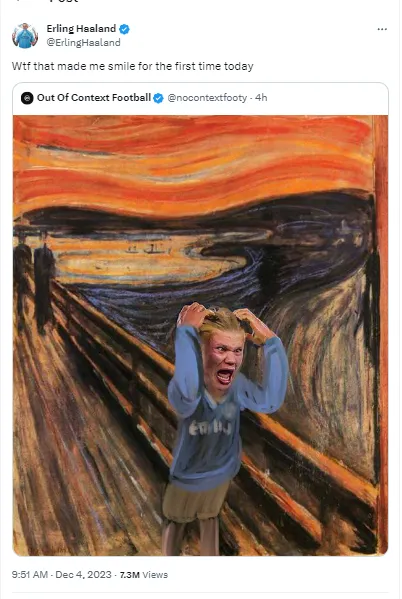 Haaland would later become a trend on social media for his anger and would retweet a meme of himself stating “Wtf that made me smile for the first time today”.