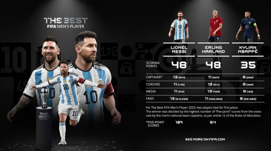 As FIFA showed, Messi claimed 107 âfive-point scoresâ compared to the Norwegianâs 64. Haaland had more votes from coaches and media, while the Argentine captain drew more support from captains and fans.