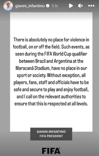 āThere is absolutely no place for violence in football, on or off the field. Such events, as seen during the FIFA World Cup Qualifier between Brazil and Argentina at Maracana stadium, have no place in our sport or society. Without exception, all players, fans, staff and officials have to be safe and secure to play and enjoy football, and I call on the relevant authorities to ensure that this is respected at all levels,ā Infantinoās statement read.