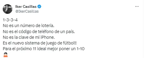 On X, Iker Casillas tweeted, “1-3-3-4, It is not a lottery number. It is not the telephone code of a country. It is not my password for my iPhone. It’s the new football game system!! For the next starting 11, it is better to put a 1-10.”