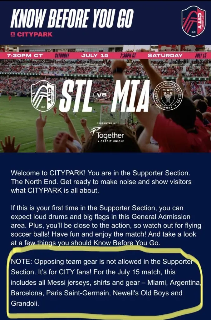 In an effort to avoid any issues the North End section, which is reserved for the Supporters Group of St. Louis CITY has issued a statement that no Messi related gear will be allowed for that game. Meaning no Messi shirts or gear, no Argentina, PSG, Newellās, and Barcelona kits.
