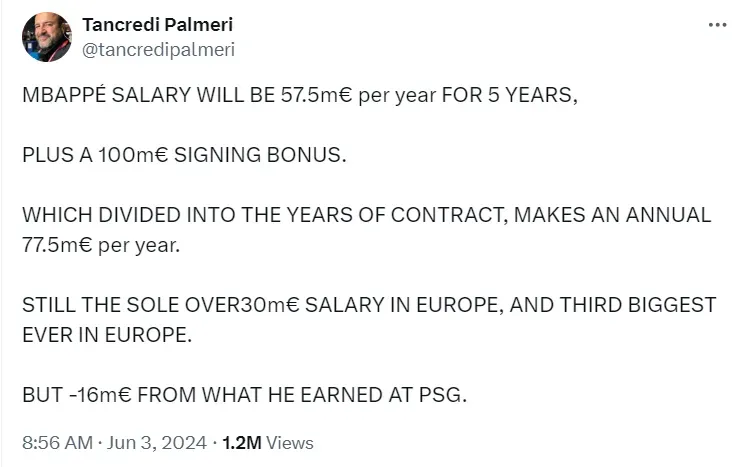 According to Italian journalist Tancredi Palmeri of Sport Italia and CNN, Real Madrid will pay Kylian Mbappe ā¬57.5 million per season for five years. On top of that, they reportedly gave him a ā¬100m signing bonus.