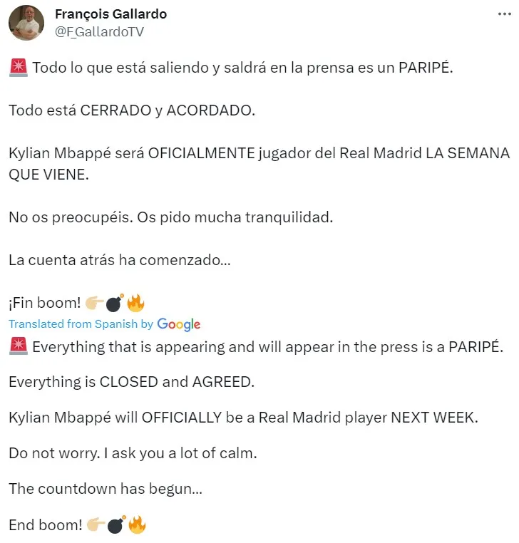 According to Spanish journalist FranƧois Gallardo of renowned TV program El Chiringuito, Kylian Mbappe has reached an agreement to join Real Madrid this summer.