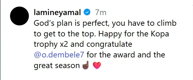 “God’s plan is perfect, you have to climb to get to the top. Happy for the Kopa trophy x2 and congratulate @o.dembele7 for the award and the great season,” wrote Yamal on Instagram.