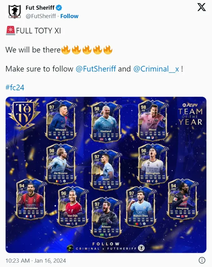 According to Fut Sheriff (@FutSheriff) on X (formerly Twitter), the EA FC 24 TOTY will be the following: Alisson (GK); Jeremie Frimpong (RWB), Ruben Dias (CB), Virgil van Dijk (CB), Theo Hernandez (LB); Jude Bellingham (CM), Rodri (CDM), Kevin De Bruyne (CAM); Lionel Messi (RW), Erling Haaland (ST), Kylian Mbappe (ST).