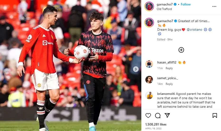 Garnacho has never hidden his admiration for Ronaldo, recreating the Portugueseās iconic goal celebrations on many occasions. He also let the world know how much he looks up to Cristiano on several Instagram posts.