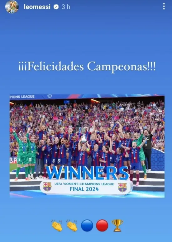 “Congratulations, champions!,” Messi wrote in Spanish as he shared a picture of Barca women’s team lifting the trophy after beating Olympique Lyon 2-0 in the grand final at San Mames on Saturday.