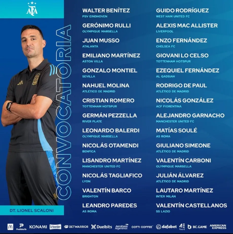 Forwards: Nicolás González, Alejandro Garnacho, Matías Soulé, Giuliano Simeone, Valentín Carboni, Julián Álvarez, Lautaro Martínez, and Valentín Castellanos.
