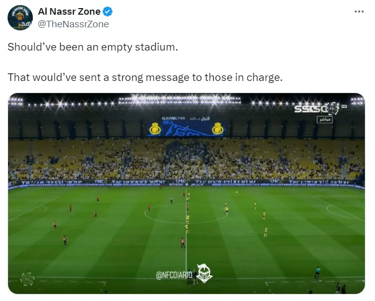 Unhappy with the front office amid an internal crisis at the club, in addition to a poor start to the new season with the loss to Al Hilal in the Saudi Super Cup, many Al Nassr fans have decided not to attend the Saudi Pro League opener.