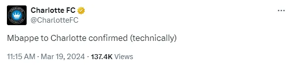 Charlotte FC raised many eyebrows on Tuesday, with their social media team claiming the 25-year-old is expected to be in the city soon. āMbappe to Charlotte confirmed (technically),ā the club said on X (formerly Twitter).