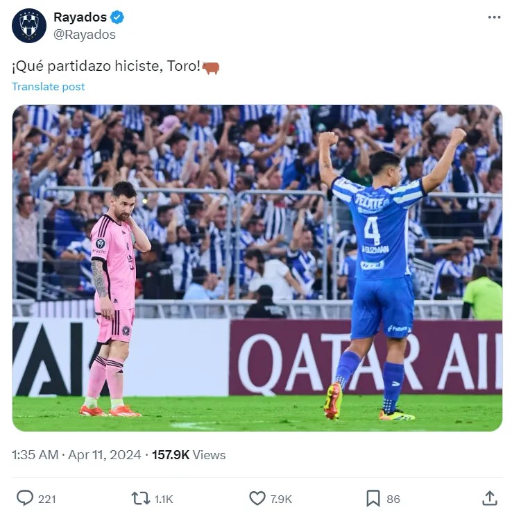 With the 3-1 win (5-2 on aggregate) and a place in the semifinal under their belt, Monterrey took another subtle jab at Messi but on their official account in Spanish. āWhat a great game you played, Toro!,ā the X post reads along with a picture of defender Victor Guzman celebrating as Messi looks dejected.