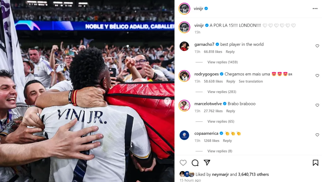 Following Real Madridās epic comeback win over Bayern Munich in the second leg of the 2023-24 UEFA Champions League semifinals, the Brazilian took to Instagram and Garnacho replied: ābest player in the world.ā
