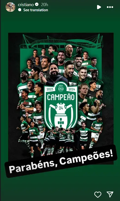 In the same weekend Real Madrid won LaLiga, Cristiano Ronaldo took to social media to celebrate Sporting CPās triumph in the Primeira Liga. āCongratulations, champions!,ā the Al Nassr superstar wrote on an Instagram story.