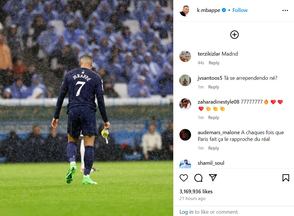 Kylian Mbappe raised many eyebrows with his latest post on Instagram. Shortly after being subbed off only 63 minutes into the derby between PSG and Marseille, the Frenchman shared a picture of the moment he left the field.