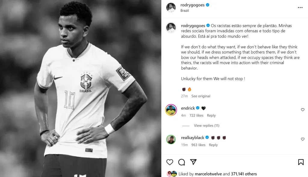 āIf we donāt do what they want, if we donāt behave as they think we should, if we wear something that bothers them, if we donāt lower our heads when we are attacked, if we occupy spaces that they think is theirs, racists take action with all this criminal behavior,ā Rodrygo added. āBut itās their bad luck, we will not stop!ā.