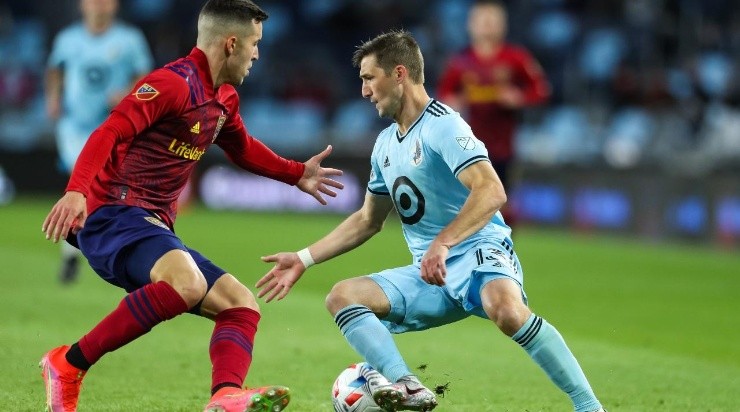 Ethan Finlay #13 of Minnesota United dribbles the ball while Aaron Herrera #22 of Real Salt Lake (Getty)