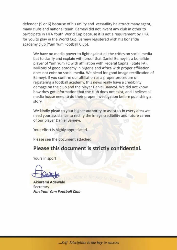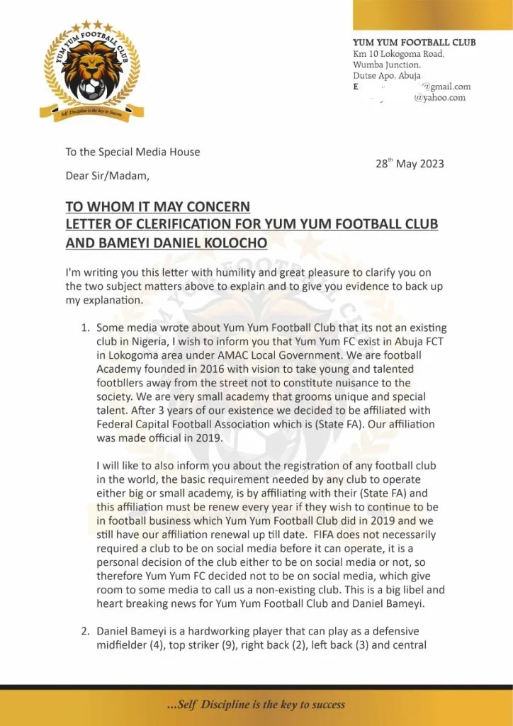 On May 30th, Bolavip received an email from a Ismail Musa, who only attached paperwork suggesting that Yum Yum does exist and that Bameyi plays a wide range of positions, and that is why he was selected to the Nigerian squad. Those documents are attached.
