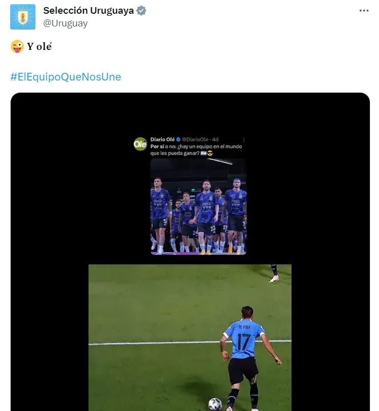 La Celeste celebrated ending their rivalsā undefeated run by poking fun at an Argentine news outlet that suggested La Albiceleste were invincible. A few days before the match, Diario Ole wrote āIs there any team in the world that can beat them?ā along with a picture of Lionel Messi and company.