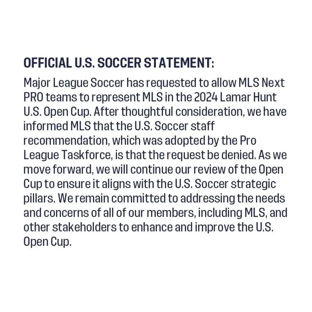 After thoughtful consideration, we have informed MLS that the US Soccer Staff recommendation, which was adopted by the Pro League Taskforce, is that the request be denied. As we move forward, we will continue our review of the Open Cup to ensure that it aligns with US Soccer strategic pillars. We remain committed to addressing the needs and concerns of all our members, including MLS, and other stakeholders to enhance and improve the US Open Cup.”
